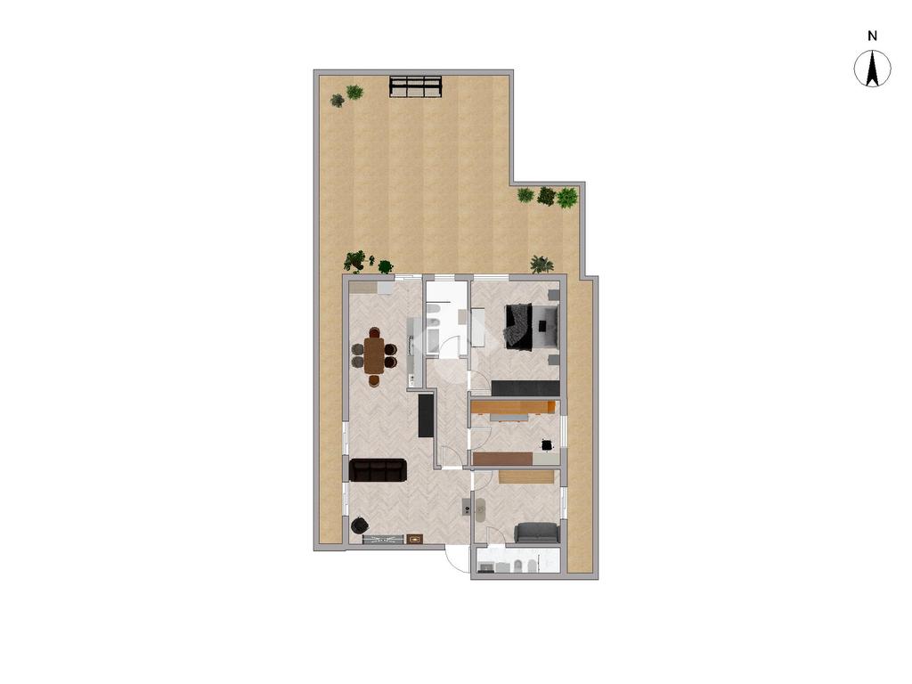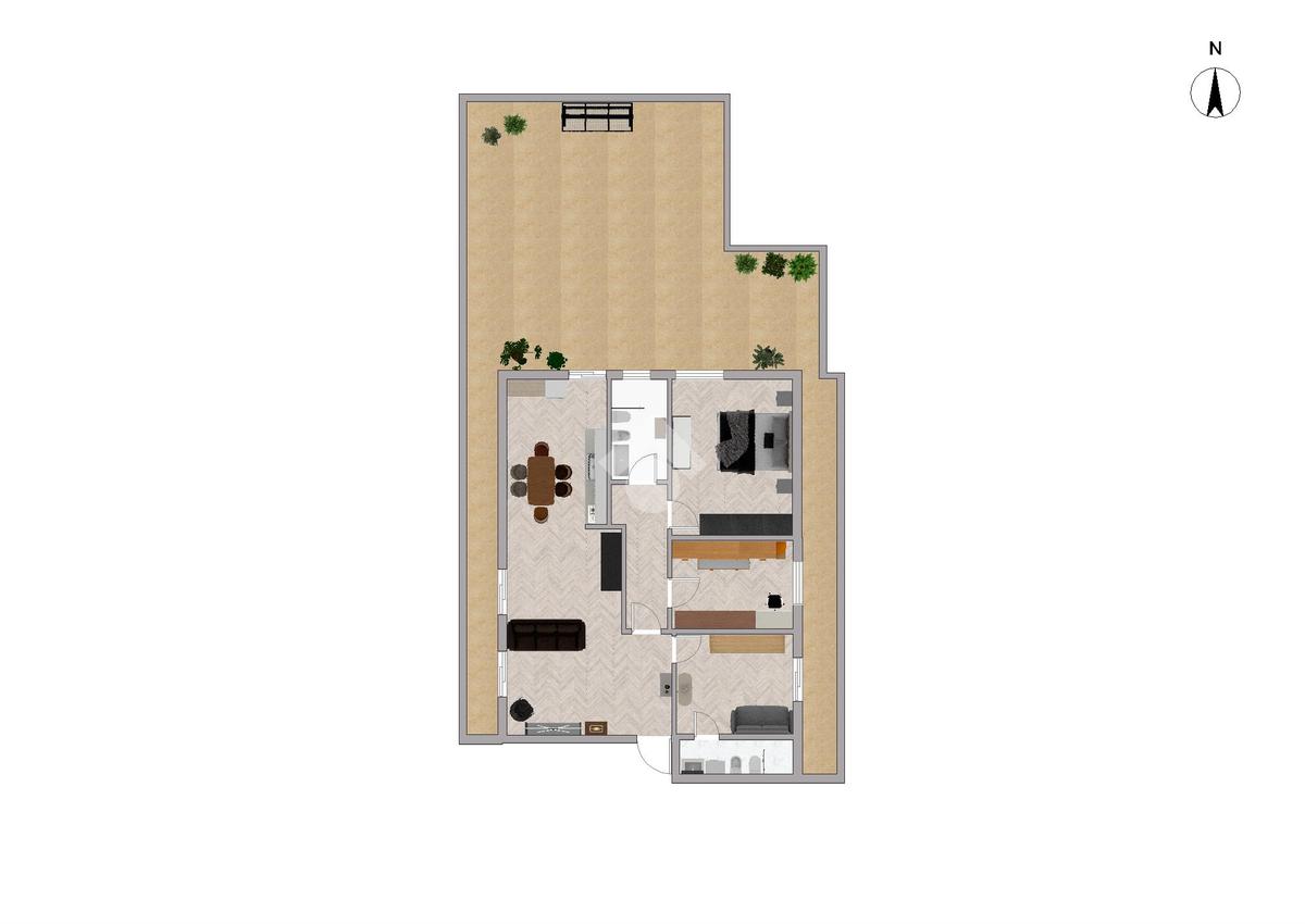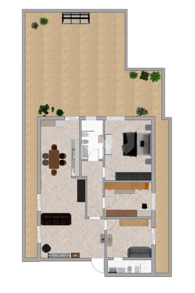 L'appartamento, situato al primo piano, è stato oggetto di una completa e recente ristrutturazione. L'ingresso conduce al luminosissimo soggiorno con doppia esposizione e alla moderna cucina open space. La zona notte comprende una confortevole camera matrimoniale e due ulteriori camere da letto. La proprietà dispone di due servizi finestrati e di un pratico vano lavanderia doppio (interno ed esterno). Il vero fiore all'occhiello è il suggestivo e ampio terrazzo a livello di circa 100 mq, uno spazio esterno generoso e riservato, perfetto per vivere piacevoli momenti di convivialità e relax.